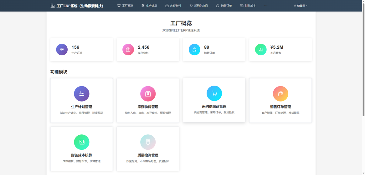 工厂ERP管理系统覆盖生产计划、物料管理、采购供应、质量控制、销售订单和财务核算等核心业务,并融入精益生产与成本控制理念,支持企业规模化、标准化发展。系统提供实时全局仪表盘,集中展示各类关键指标,如库存物料数量、订单完成进度、质量合格率及集团营业收入等。