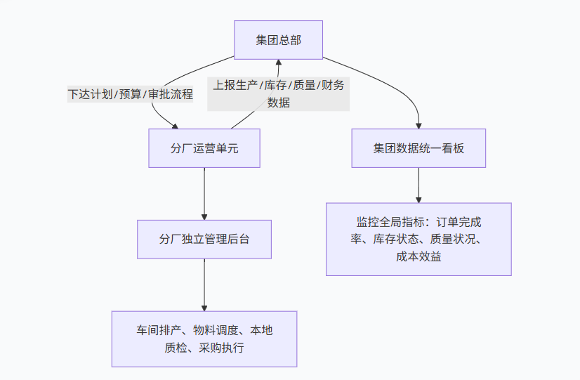 该系统通过总部层面实现策略制定、资源分配与绩效评估,在分厂层面支持柔性生产与实时调度,数据双向实时同步,满足集团化企业的多元化管理需求。