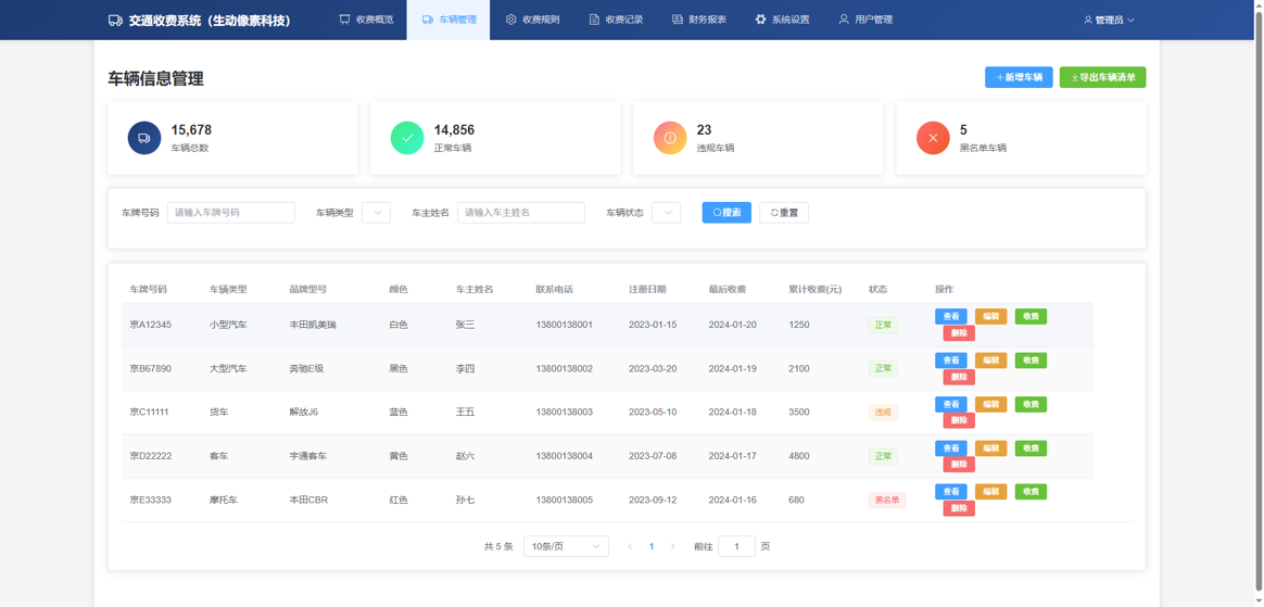 作为系统的基础数据核心,该模块实现对车辆基础属性(车牌、车型、颜色、品牌)、车主信息、车辆状态(正常、违规、黑名单)的全生命周期管理。支持海量车辆信息的快速检索、批量导入导出、状态变更与历史追溯,为收费、稽查等业务提供准确的数据依据。