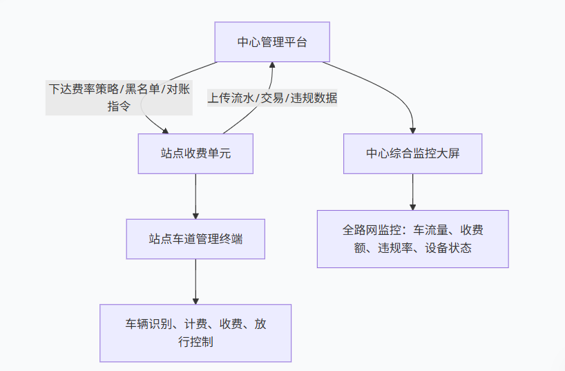 交通收费管理系统是专为道路运营、桥梁隧道、停车场等交通场景设计的一体化智慧管理平台,旨在实现车辆信息管理、费用核算、违规监控与财务清分等核心业务的数字化运营。系统采用“中心-站点”双层管理架构,既支持集团中心对全路网收费数据的实时监控与策略统一下发,又保障各收费站点在本地车辆处理、费额计算和异常处置上的高效性与灵活性。
