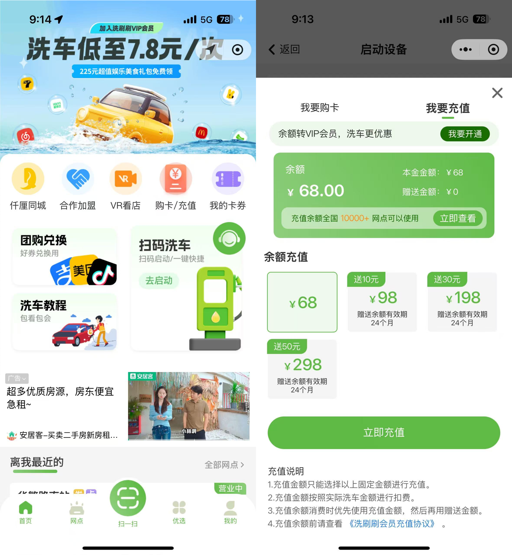 新用户进入小程序后,可根据引导选择充值面额(如充值298元送50元),充值金额立即进入账户(分为本金与赠送金额)。用户到达网点后,扫描设备二维码,系统优先扣减本金金额,洗车完成后显示剩余余额,全程无需人工干预。