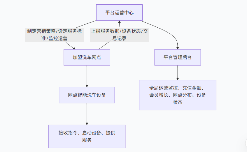 自助洗车服务平台是基于移动互联网的一站式汽车服务解决方案,旨在通过数字化手段连接车主与洗车网点,提供便捷、高效的洗车服务体验。平台采用"用户端-商户端-平台管理端"三重架构设计,既保障了终端用户的灵活操作与多样化选择,又实现了加盟网点的标准化服务管理与平台方的集中化运营监控。