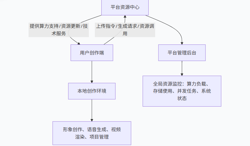 该架构实现了平台与用户终端之间资源与数据的智能分配和高效协同,既满足了平台对资源调度和服务质量的统一管控,又保障了用户创作过程的流畅性与灵活性。