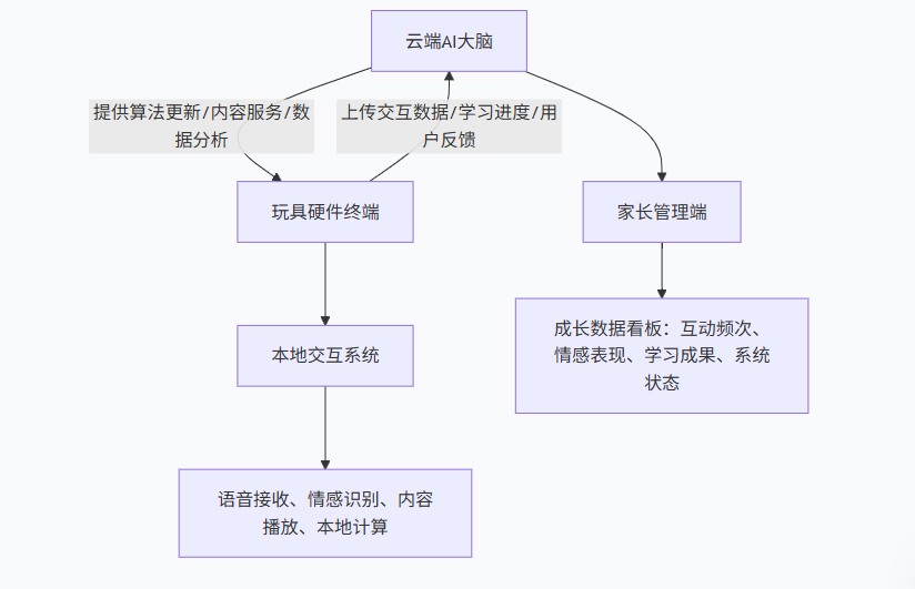 云端AI平台:提供更复杂的自然语言理解、情感分析和学习内容推荐算法,通过定期模型更新使玩具变得越来越"聪明"。